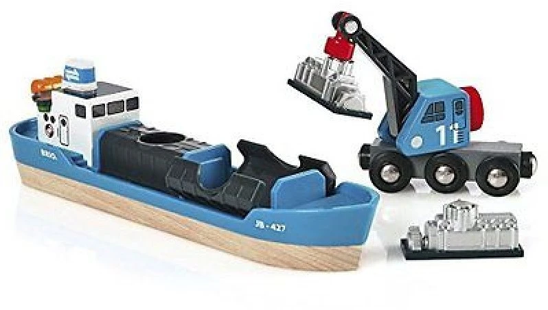 Aye aye Kapitän! Transportiere mit diesem Containerschiff die Fracht vom Wasser aufs Land. Benutze den beweglichen Kran um die Ladungen hochzuheben und sie auf jedem beliebigen BRIO Zug abzusetzen.