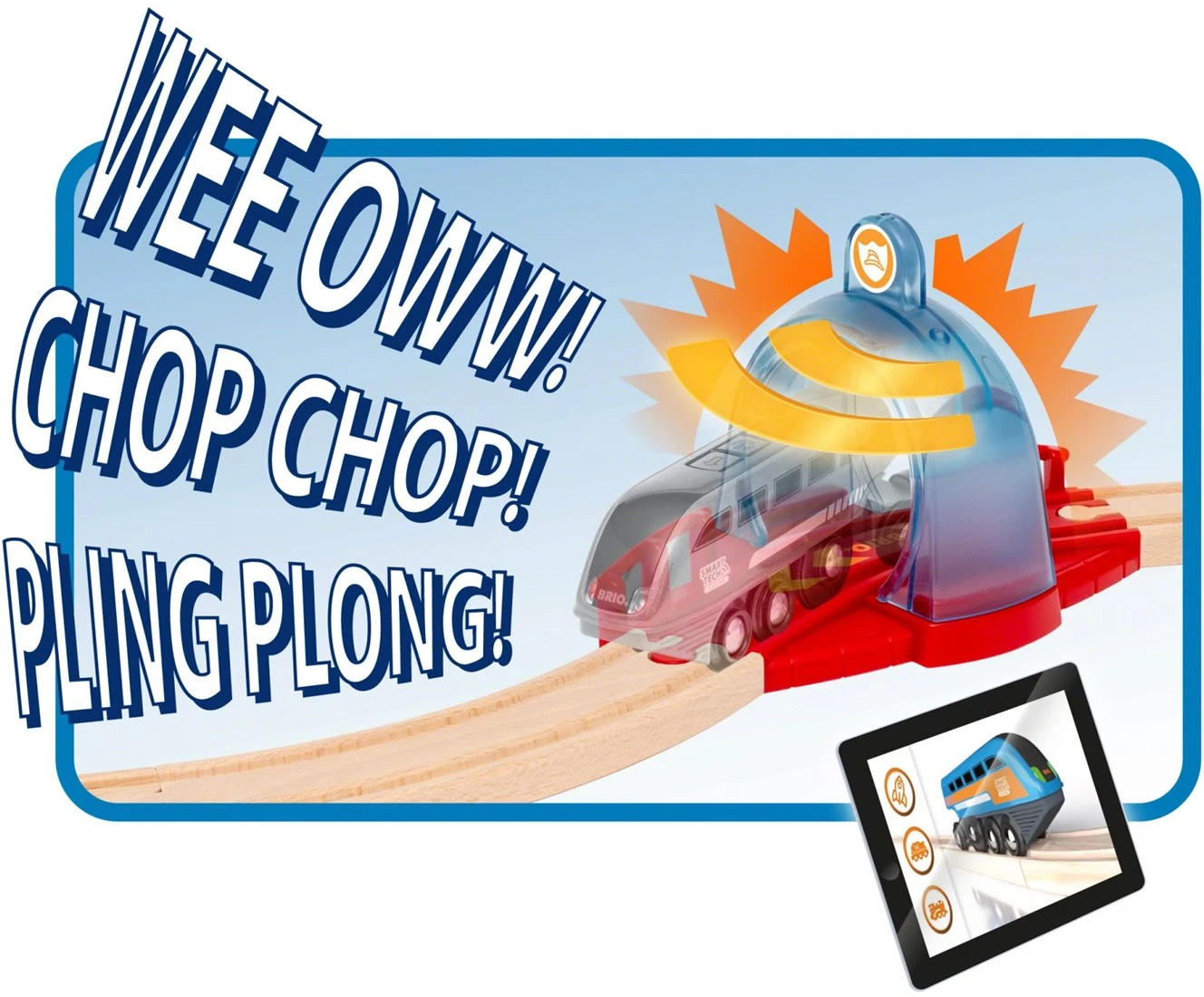 „Oh nein! Es brennt!“ Mit dem 33976 Smart Tech Sound Feuerwehreinsatz bringst du die Feuerwehr auf deine BRIO World Streckenführung. Werde zur Feuerwehr und lösche das Feuer mit Hilfe des Wasserschlauchs des Feuerwehrwaggons. Spielst du den Feuerwehreinsatz mit der 33971 Smart Tech Sound Lok mit Aufnahmefunktion (nicht enthalten) macht dein Bahnspiel durch die spannenden Funktionen noch mehr Spaß. Wenn der Zug durch den Tunnel fährt, erklingen die voreingestellten Rettungsgeräusche. Mit der Smart Tech Sound-App sind weitere Anpassungen möglich.