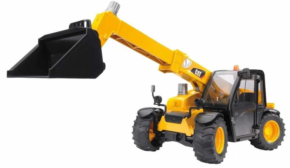 Der CATERPILLAR Teleskoplader ist ein wahres Multitalent. Ob es um das Schaufeln von großen Erdmassen, oder um das Verladen von empfindlichen Gütern auf Paletten geht, jederzeit ist der CAT Teleskoplader ein zu-verlässiger und effektiver Partner. Gerade seine geringen Abmessungen in Kombination mit dem weit ausfahr-baren Teleskoparm machen ihn oft zur ersten Wahl in den unterschiedlichsten Einsatzgebieten. über vier sil-bern hervorgehobene Drehgriffe funktioniert die präzise Steuerung des CAT-Modells. Neben den Funktionen wie Verstellen der Armhöhe, Ausfahren des Arms und Winkelverstellung der Werkzeugaufnahme verfügt der Teleskoplader über eine gut arbeitende Vierradlenkung. Diese Lenkung des CAT Teleskopladers macht das Handling des Fahrzeuges, sowohl beim Original, als auch bei dem Modell von BRUDER, zu einem Kinderspiel.