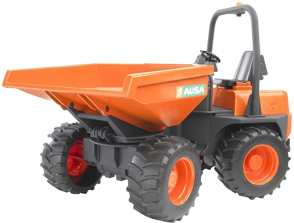 BRUDER ergänzt das überaus erfolgreiche Sortiment der kleineren Baufahrzeuge um einen so genannten Minidumper. Hierbei handelt es sich meistens um knickgelenkte, kompakte Maschinen, die den Transport von bis zu 4 Tonnen Last auf unebenen und schwer zugänglichem Gelände ermöglichen. Mit Hilfe des Allradantriebs und ihrer Knicklenkung wird eine enorme Wendigkeit erzielt, wobei alle vier Räder in ständigem Bodenkontakt gehalten werden. Als Vorbild für das neue BRUDER Modell dient der Dumper D 350 AHG der spanischen Firma AUSA. Wie das Vorbild verfügt der BRUDER Dumper über eine Knicklenkung, eine drehbare Kippmulde und zeichnet sich, wie das Original, durch eine hohe Geländegängigkeit aus. Das Fahrzeug ist mit einer Heckkupplung ausgestattet