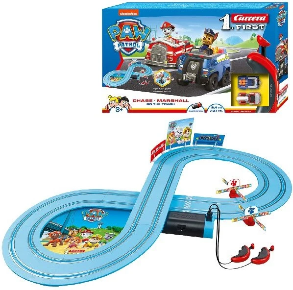 Carrera 369-3033 FIRST PAW PATROL On the Track 2,4m Rennstrecken-Set | 2 ferngesteuerte Fahrzeuge mit Chase und Marshall | mit Handregler & Streckenteilen | Spielzeug für Kinder ab 3 Jahren