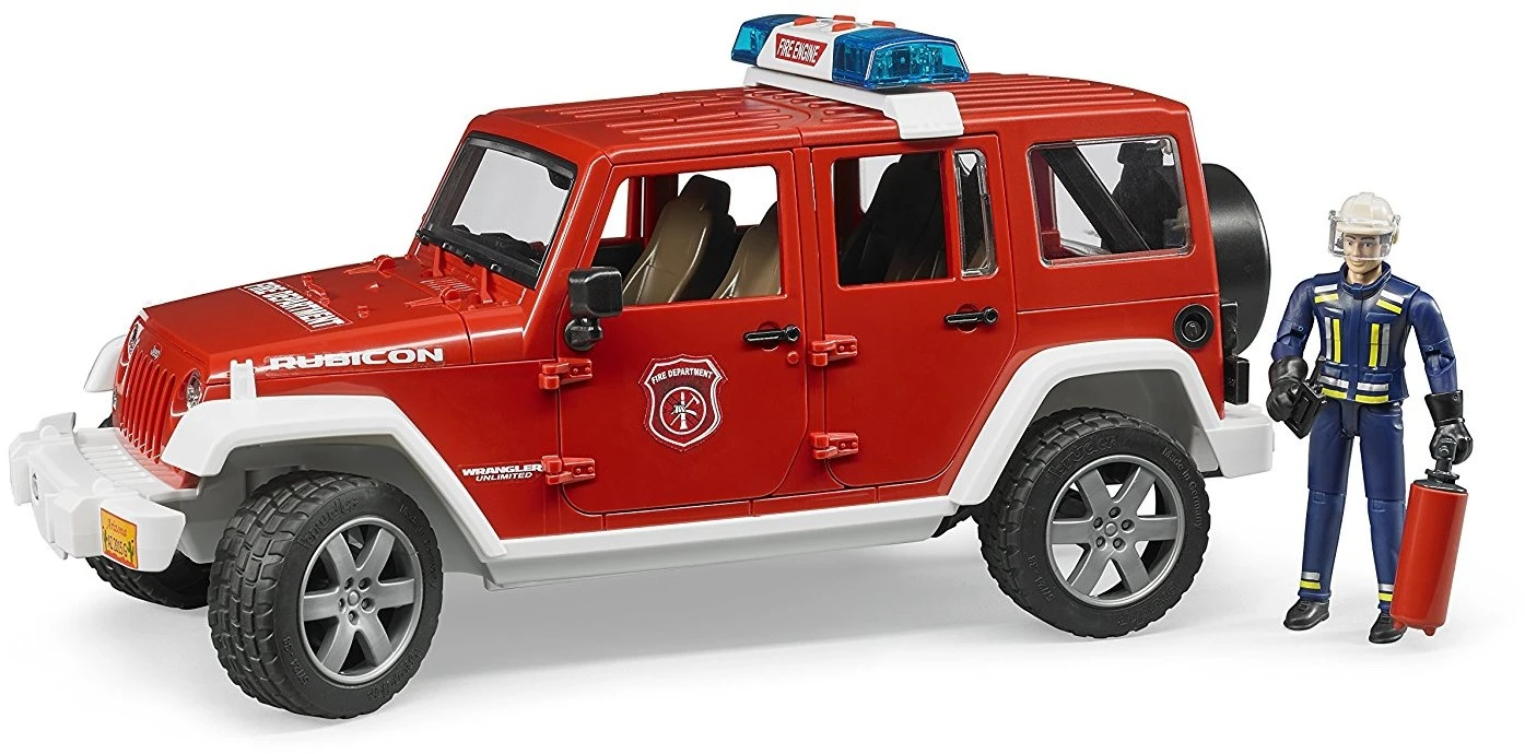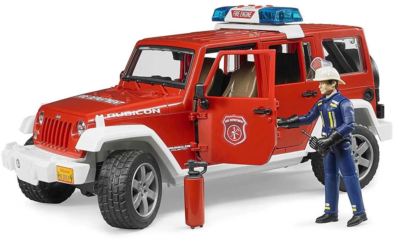 Bei der Koordination von Feuerwehr-Einsätzen, sowie bei kleinen Notfällen wird das Feuerwehr Einsatzfahrzeug benötigt. Durch seine Robustheit und Geländegängigkeit ist der Jeep Wrangler Unlimited Rubicon die ideale Basis für diesen Zweck. Der Leiter vom Dienst in seinem Führungsfahrzeug koordiniert den Einsatz beim Retten von Menschenleben und der Brandbekämpfung und legt aber auch selbst Hand an. Das BRUDER-Modell ist wie das Original, mit geländegängigen, gefederten Achsen ausgestattet. Die Achsschenkellenkung mit Lenkstangenverlängerung durch das Fahrzeugdach ermöglicht das Nachspielen der Einsatzszenen. Türen, Motorhaube und Laderaum lassen sich öffnen und schnell beladen. Die Feuerwehrfigur lässt sich durch beiliegendes Zubehör, wie Feuerlöscher und Funkgerät, ausstatten. Die Einsatz-Lichteinheit mit Sirene auf dem Dach macht den Weg beim Einsatz frei. Neben drei verschiedenen Sirenenlauten kann auch das Motorgeräusch des Fahrzeugs erzeugt werden. So realistisch kann im Kinderzimmer der Feuerwehr-Einsatz nachgespielt werden – €žJust like the real thing