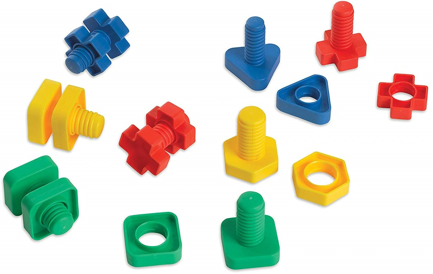 Große, mehrfarbige, vielfach geformte Schrauben und Muttern mit unterschiedlichen Gewinden.