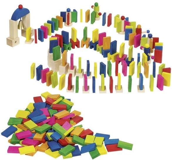Jetzt kommt Bewegung ins Kinderzimmer! Mit der einzigartigen Domino-Rallye aus bunten Holzbausteinen, Klötzen und funktionstüchtigem Drehkreuz lassen sich interessante Varianten bauen. Haben die Steine ihr Ziel erreicht, klingelt ein Glöckchen. Stein: 2,2 x 4 x 0,5 cm