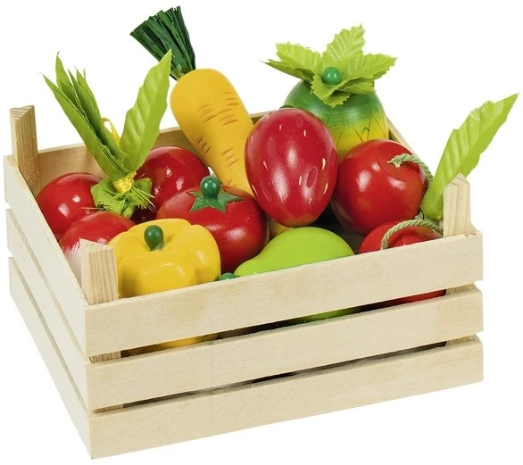 Goki Obst und Gemüse in Kiste. Eine Kiste gefüllt mit Obst und Gemüse – die ideale Bestückung für den Marktstand (Art. 5188) oder den Kaufmannsladen (Art. RA21).