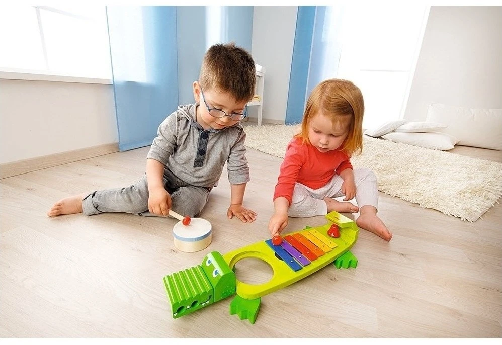 - das kunterbunte Klang-Kroko vereint vier wunderbare Klanginstrumente: Ratter, Trommel, Metallophon und Glocke
