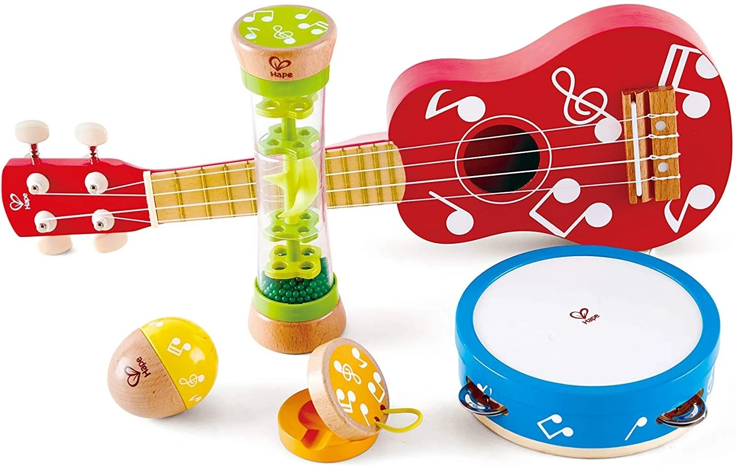 Hape E0339 Mini-Band Set – Ukulele, Tamburin, Kastagnette, Rassel und Regenmacher