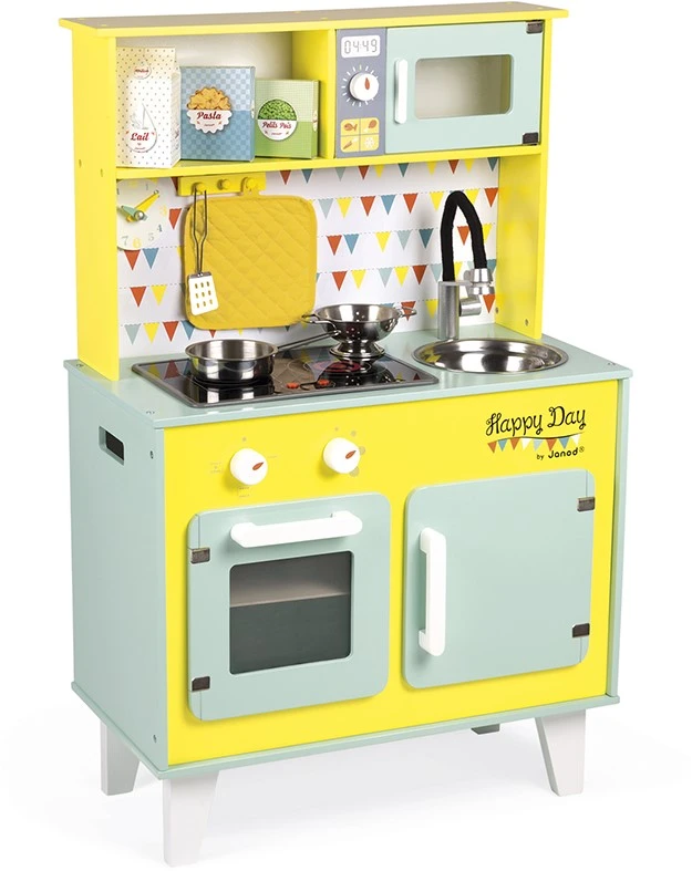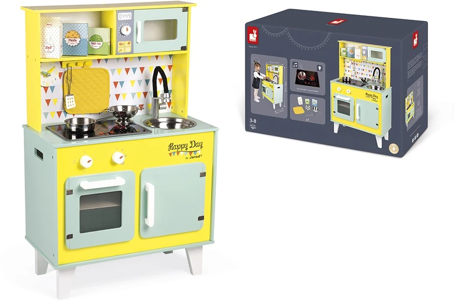 Wie Papa und Mama – bereite leckere kleine Gerichte für Deine Freunde zu und werde zu einem richtigen kleinen Meisterkoch!!! Mit Licht- und Soundfunktion und 7 Teile Zubehör. In den Trendfarben türkis und gelb. Ausgestattet mit einer Uhr mit funktionierenden Zeigern, einer Hakenleiste zum Aufhängen der Löffel, einer Metallspüle, einer Tafel, einer Induktionskochplatte mit Ton und LED (man muss nur auf die roten Knöpfe drücken, um die Platten einzuschalten und kann das Geräusch von kochendem Wasser hören). Genauso wie eine richtige Küche ist sie mit drei Drehknöpfen (davon zwei mit Geräuscheffekten), einem Backofen, einer Mikrowelle und einem Schrank mit magnetischen Türen versehen. Inklusive 7 Zubehörteile: 1 Metallpfanne, 1 Metallsieb, 1 Metalllöffel, 1 Topflappen und 3 Lebensmittelpackungen aus Karton. Höhe der Arbeitsfläche: 50 cm.