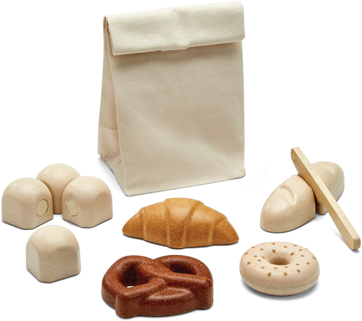 Veranstalten Sie einen Familienbrunch oder bereiten Sie sich auf ein Picknick im Park vor? Bringen Sie das Brotset mit, um Ihre Mahlzeit zu vervollständigen! Dieses Spielset enthält einen Bagel, 4 abnehmbare Brötchen, eine Brezel, ein Croissant, ein schneidbares Baguette, ein Messer und einen Stoffbeutel zur Aufbewahrung. Empfohlenes Alter: Ab 2 Jahren.