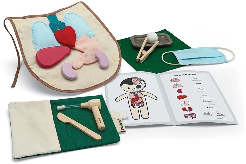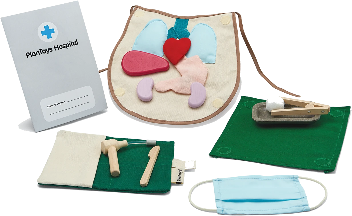 Spielen Sie die Rolle eines Chirurgen und lernen Sie etwas über den menschlichen Körper mit dem Chirurgen-Set! Dieses Spielset enthält ein Stoffteil, das mit verschiedenen Organen beschriftet ist (Bronchien, Lunge, Herz mit einem Piep-Knopf, Magen mit einem Stück Nahrung darin, Leber und Nieren), die für ein realistisches Vorstellungsspiel mit Puppen und ausgestopften Freunden verwendet werden können. Außerdem gibt es eine Aufbewahrungstasche für die mitgelieferte medizinische Ausrüstung (Skalpell, Pinzette, Wattestäbchen, OP-Tuch, medizinische Maske, Absaugvorrichtung und PlanWood-Schale). Dieses einzigartige Set fördert die Feinmotorik, das logische Denken, die Problemlösungskompetenz, die Hand-Augen-Koordination und vieles mehr!. Empfohlenes Alter: Ab 3 Jahren.
