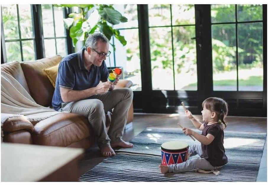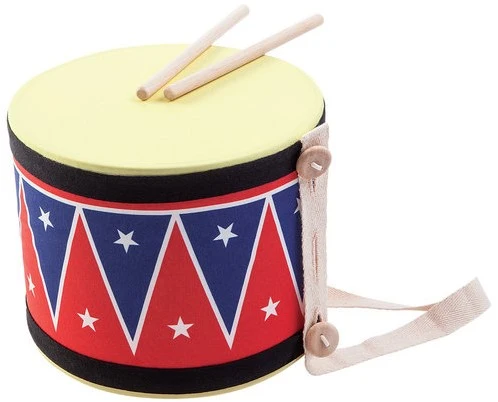 Trommelwirbel, bitte! Diese große Trommel ist mit einer verstellbaren Schnur und einem Paar Trommelstöcken ausgestattet, damit Ihr Kind so tun kann, als wäre es in einer Marschkapelle. Das Trommelfell besteht aus mit Naturkautschuk beschichtetem Stoff und sorgt für ein sanftes, aber realistisches Musikerlebnis. Empfohlenes Alter: Ab 3 Jahren.