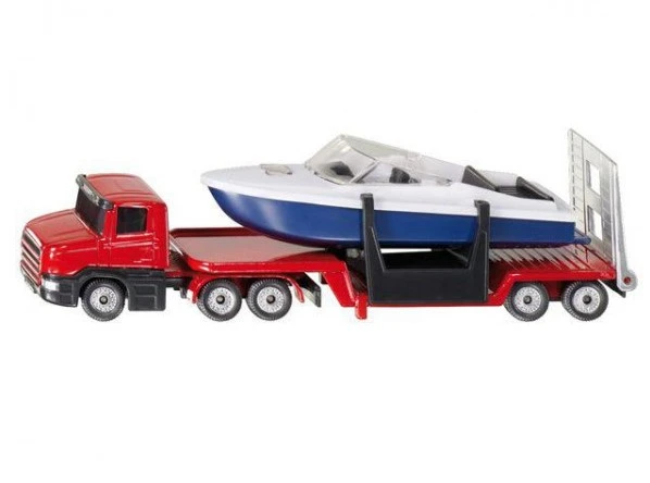 Detailliertes Spielzeug eines Tiefladers mit Boot zum Spielen und Sammeln – Robustes und stabiles Design dank Metallkarosserie, Abkoppelbarer Tieflader, Öffenbare Heckklappe, Schwimmfähiges Boot, Sehr gute Rolleigenschaften durch Bereifung aus Kunststoff – Ideal als Geschenk für Kinder zu bspw. Geburtstagen oder für zwischendurch geeignet, aber auch als Dekoration für Erwachsenen-Geburtstage oder Hochzeitsgeschenke – Perfekt zum platzsparenden Mitnehmen, Langanhaltender Spielspaß durch unzählige Kombinationsmöglichkeiten innerhalb der SIKU Spielwelt – Lieferumfang: 1x SIKU 1613 Tieflader mit Boot, Material: Metall/Kunststoff, Abmessungen: 15,8 x 3,6 x 4,5 cm, Gewicht: 0,113 kg, Farbe: Rot/Blau/Weiß
