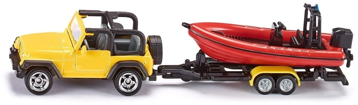 Detailliertes Spielzeugmodell eines Jeep mit Bootsanhänger und passendem Boot im Hosentaschenformat zum Spielen und Sammeln – Robustes und stabiles Design dank Metallkarosserie, Abnehmbarer Trailer, Schwimmfähiges Boot, Sehr gute Rolleigenschaften durch Bereifung aus Gummi/Kunststoff – Ideal als Geschenk für Kinder zu bspw. Geburtstagen oder für zwischendurch geeignet, aber auch als Dekoration für Erwachsenen-Geburtstage oder Hochzeitsgeschenke – Perfekt zum platzsparenden Mitnehmen, Langanhaltender Spielspaß durch unzählige Kombinationsmöglichkeiten innerhalb der SIKU Spielwelt – Lieferumfang: 1x SIKU 1658 Jeep mit Boot, Material: Metall/Kunststoff, Abmessungen: 16,7 x 3,3 x 4,2 cm, Gewicht: 0,06 kg, Farbe: Gelb/Rot, Serie: SIKU SUPER