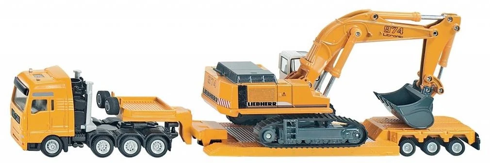 Detailliertes Spielzeugmodell eines Schwertransport mit Tiefbettauflieger und Liebherr Großbagger mit Tieflöffel zum Spielen und Sammeln – Umfangreiche Funktionen: Abkoppelbarer Auflieger, Zugmaschine mit anderen Anhängern im gleichen Maßstab kombinierbar, Beweglicher Baggerarm sowie Schaufel – Langanhaltender Spielspaß durch unzählige Kombinationsmöglichkeiten innerhalb der SIKU Spielwelt – Ideal als Geschenk für kleine und große LKW- und Bagger-Fans geeignet, Perfekte Ergänzung zu SIKU Spielwelten – Lieferumfang: 1x SIKU 1834 Schwertransport mit Auflieger und Bagger, Maßstab: 1:87, Material: Metall/Kunststoff, Abmessungen: 27,5 x 5,5 x 8,1 cm, Gewicht: 0,37 kg, Farbe: Blau(Gelb, Serie: SIKU SUPER