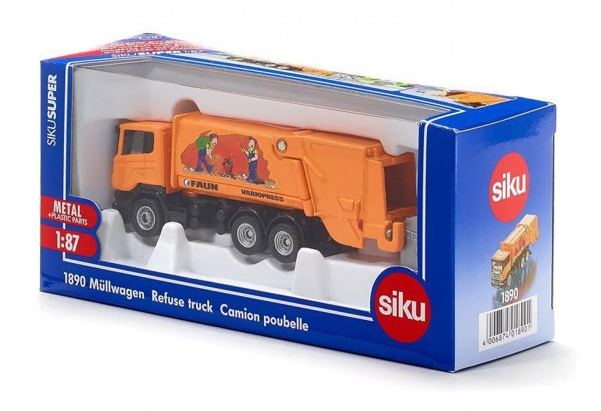 Originalgetreues Müllentsorgungsfahrzeuges inkl. Großraummüllbehälter als Zubehör zum Spielen und Kombinieren mit weiteren SIKU Spielzeugen – Robustes und stabiles Design, Hebevorrichtung für klappbaren Müllbehälter, Sehr gute Rolleigenschaften durch Bereifung aus Gummi – Langanhaltender Spielspaß durch unzählige Kombinationsmöglichkeiten innerhalb der SIKU Spielwelt – Ideal als Geschenk für kleine und große Fans von Kommunalfahrzeugen geeignet, Perfekte Ergänzung zu SIKU Spielwelten – Lieferumfang: 1x SIKU 1890 Müllwagen inkl. Mülltonne, Maßstab: 1:87, Material: Metall/Kunststoff, Abmessungen: 13,6 x 3 x 4 cm, Gewicht: 0,158 kg, Farbe: Orange, Serie: SIKU SUPER