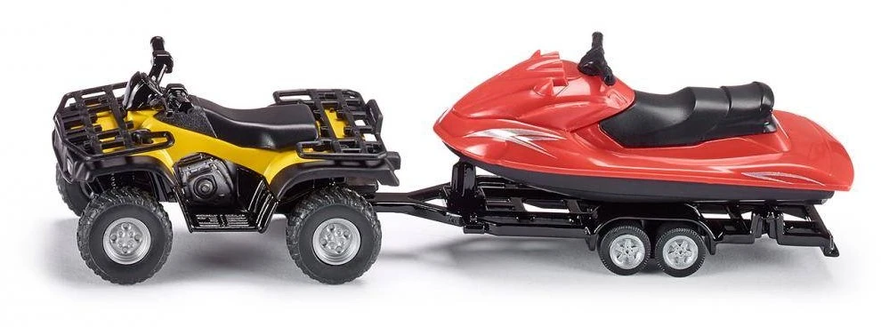 Detailliertes Spielzeugmodell eines Quad mit Anhänger und dazugehörigem Jet-Ski zum Spielen und Sammeln – Robustes und stabiles Design dank Karosserie aus Metall, Schwimmfähiger Jet-Ski, Abkoppelbarer Anhänger – Langanhaltender Spielspaß durch unzählige Kombinationsmöglichkeiten innerhalb der SIKU Spielwelt – Ideal als Geschenk für kleine und große Quad- und Jet-Ski-Liebhaber geeignet, Perfekte Ergänzung zu SIKU Spielwelten – Lieferumfang: 1x SIKU 2314 Quad mit Anhänger und Jet-Ski, Maßstab: 1:50, Material: Metall/Kunststoff, Abmessungen: 15,1 x 3,5 x 3,9 cm, Gewicht: 0,073 kg, Farbe: Gelb/Rot, Serie: SIKU SUPER